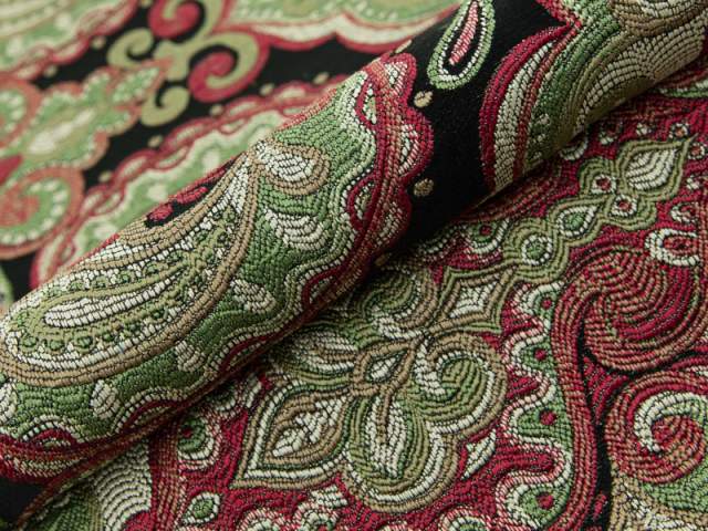 Poťahová látka BOMBAJ 563 – Kolekcia Bombaj odkazuje na bohato zdobený indický vzor. Textúra materiálu mu dodáva exkluzívny štýl a bohaté farby umožňujú jeho zladenie s každým interiérom. Bombaj sa bude hodiť ako poťah na sedačku, dekoračné vankúše, ale aj okenné závesy. Čistenie jemnými prostriedkami na údržbu čalúnenia. Nečistite za mokra. Nežehliť. Nebieliť